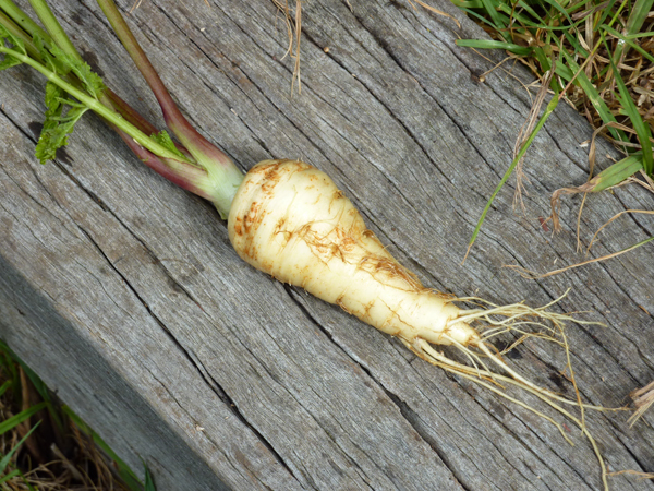 Best grown in deep sandy, loamy soil. Use fresh seed and soak seed overnight then, after planting, keep seeds moist until seed germinate. Similar to starting carrots, maybe cover with a wooden plank or mulch until seeds germinate. They will completely fail if the seed dries out after planting and it's not unusual to have an entire packet fail. Difficult to grow in summer as the seed dries out fast and won't germinate. Leave in the ground until after frost or at least a couple of weeks of really cold weather. The cold results in the starch in the roots being converted into sugars which give the parsnip its sweet taste. Use a spade to dig the parsnip out of the ground.